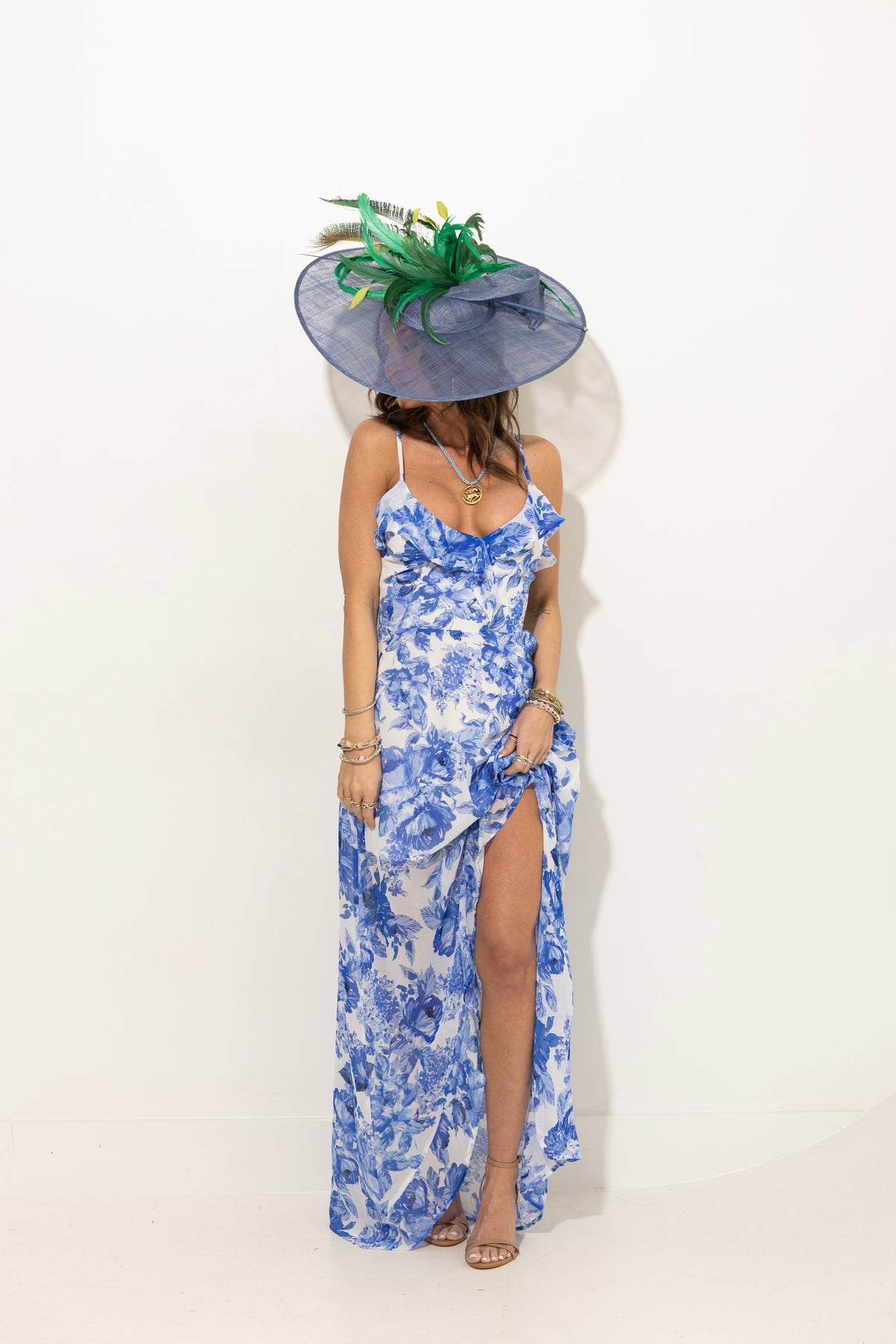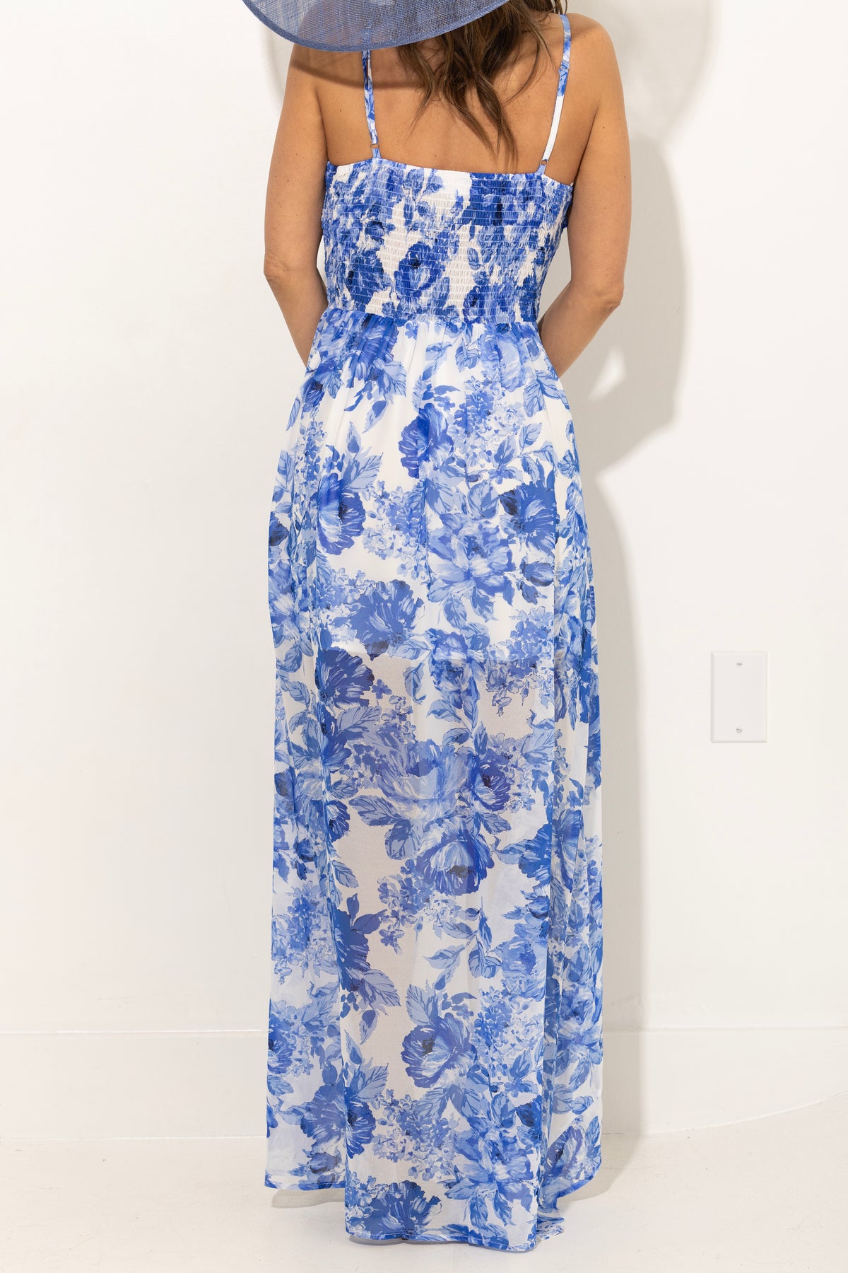 Elevate your style in this chic, breezy chiffon maxi dress featuring front slit with ruffle hem. Smocked backing with adjustable straps for the perfect fit! Size pictured, small.