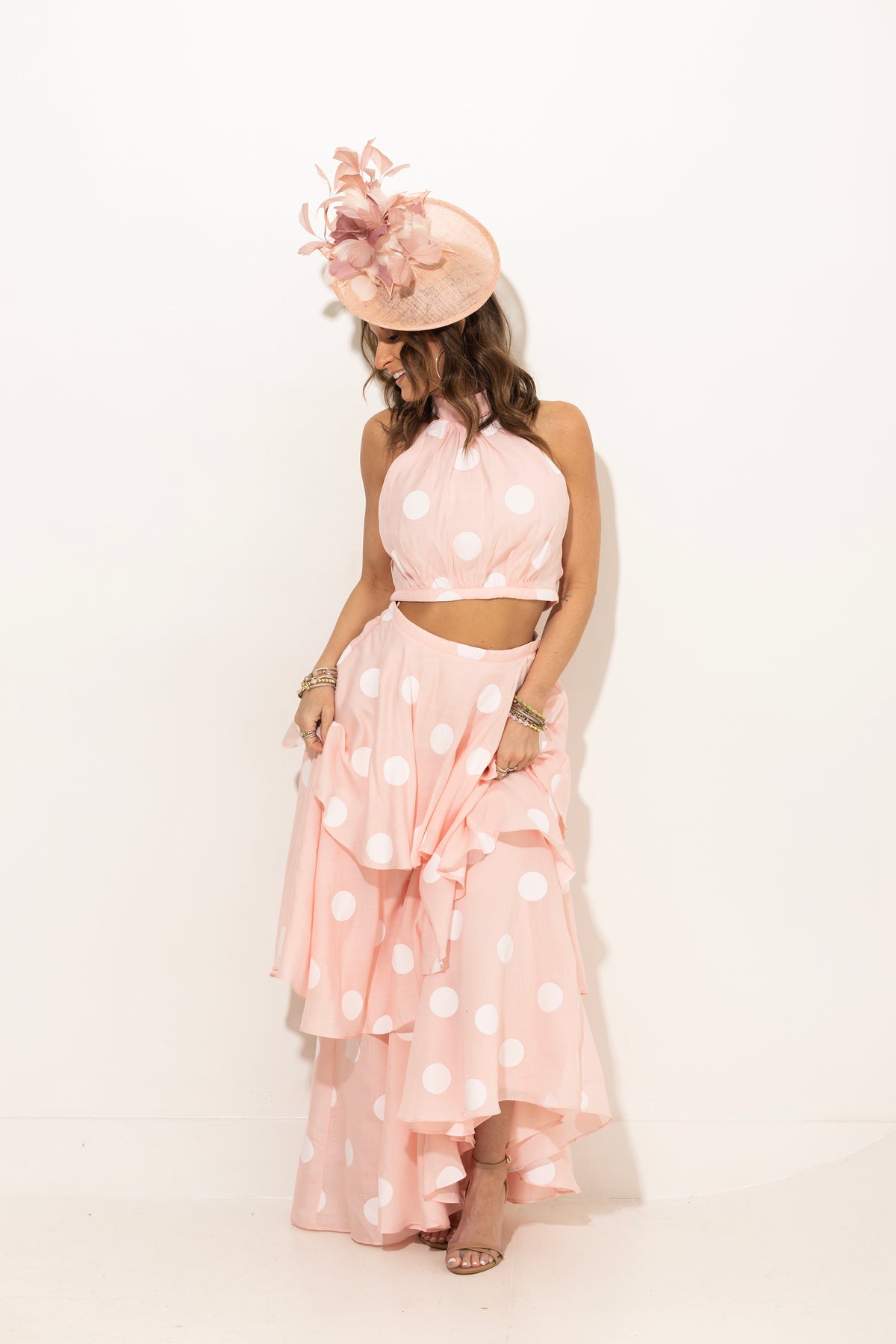 Sophisticated and charming, this soft pink polka dot set is perfection! Tiered ruffle maxi skirt with slightly cropped halter top with hidden back zipper. Size pictured, small.