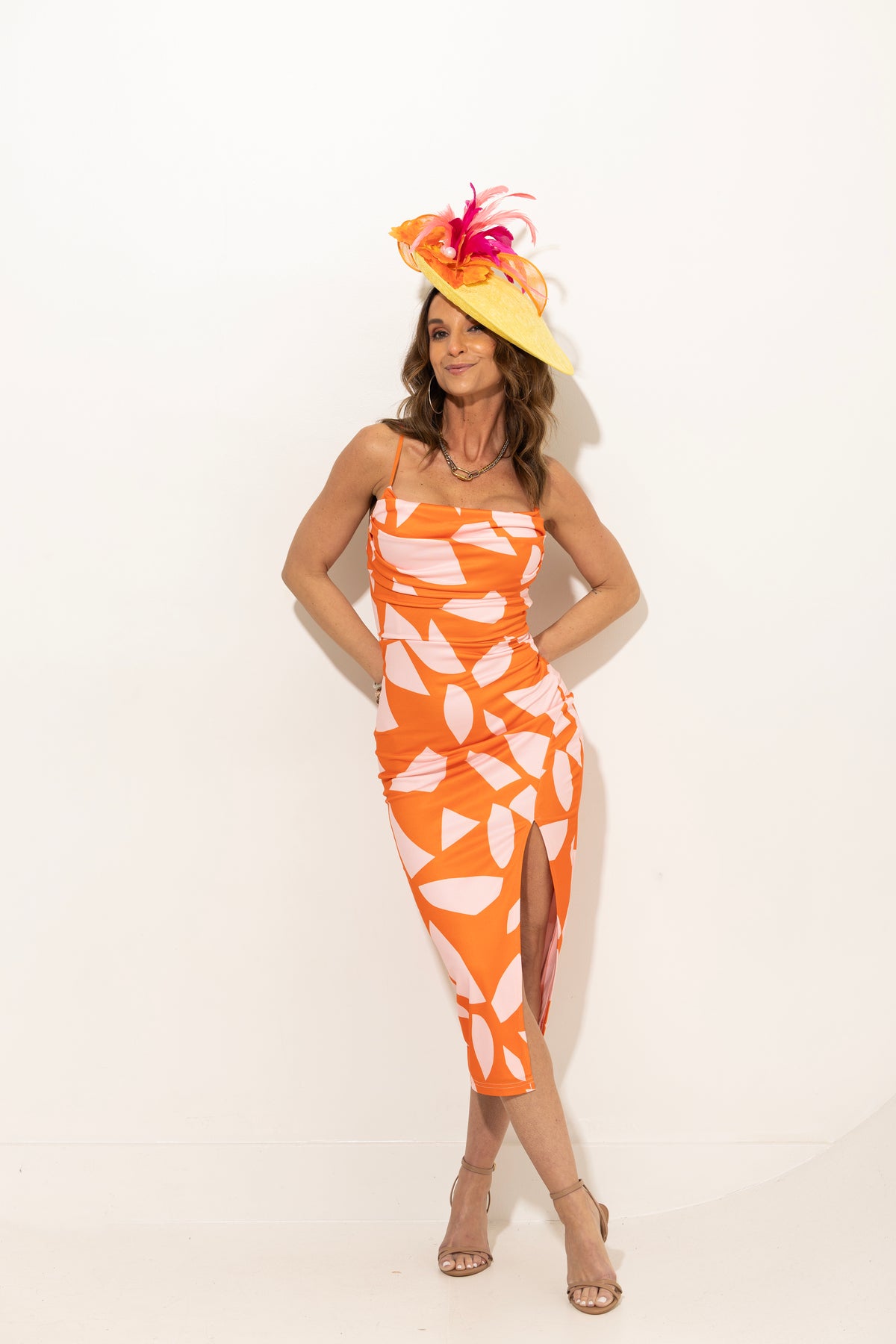 Meet our Meryl Midi Dress! She is bright & bold, sure to cause a scene. Soft lining with adjustable straps and front slit. Size pictured, small.