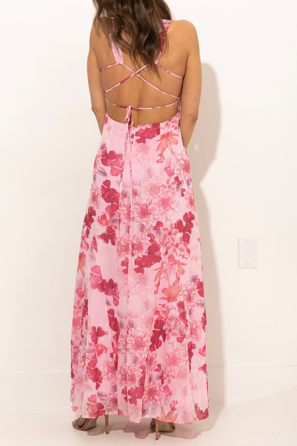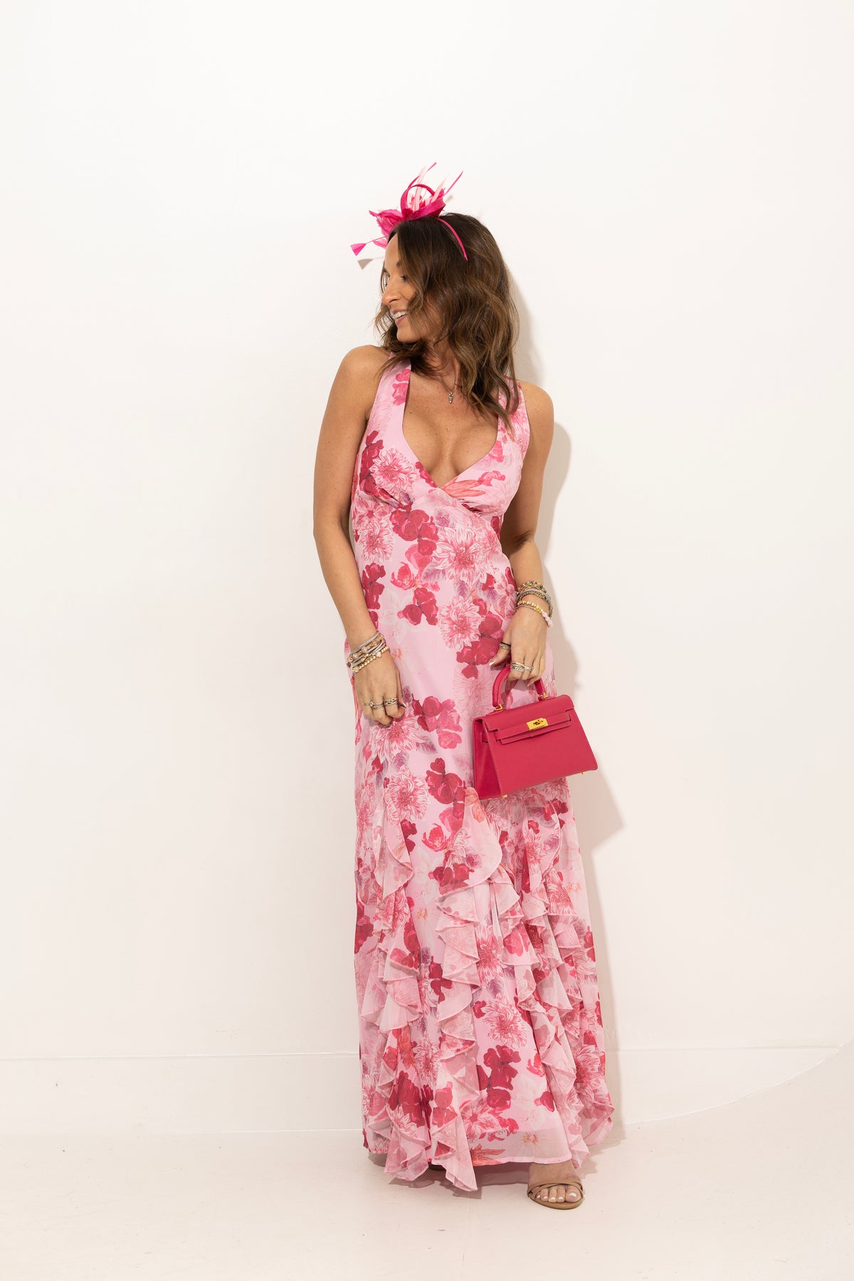 Embrace effortless elegance in this Photo Finish Floral Maxi Dress. A plunging neckline and open back with adjustable self-tie straps create a romantic silhouette, while the ruffled hem adds playful movement. The light pink base blooms with deeper raspberry and hot pink florals, delivering a feminine aesthetic the Kentucky Oaks or Kentucky Derby, weddings, or sunset celebrations. Adjustable straps ensure a custom fit, making this dress as comfortable as it is stunning. Size pictured, small.