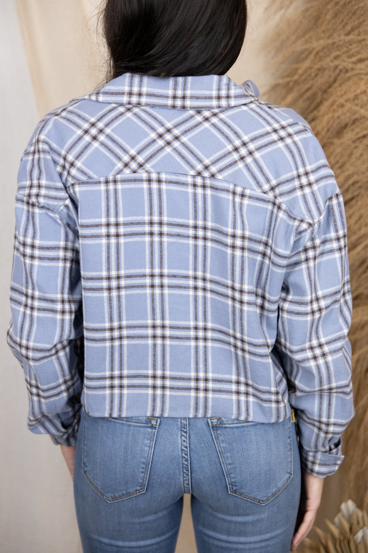 Throw our Picture Perfect Cropped Flannel over any simple outfit. Front pockets, cuffed sleeves, and a notched collar. Runs small. Size pictured, small.