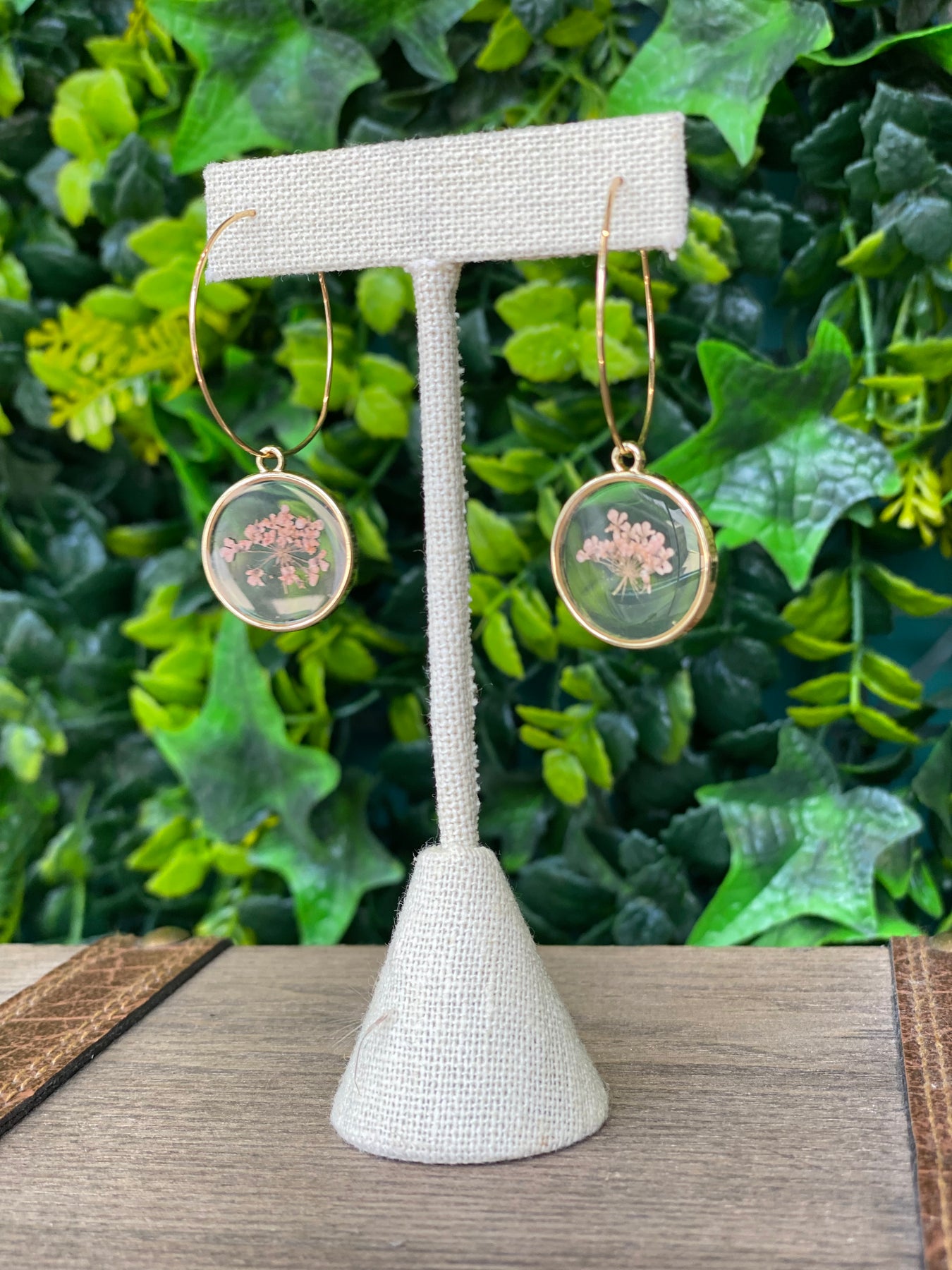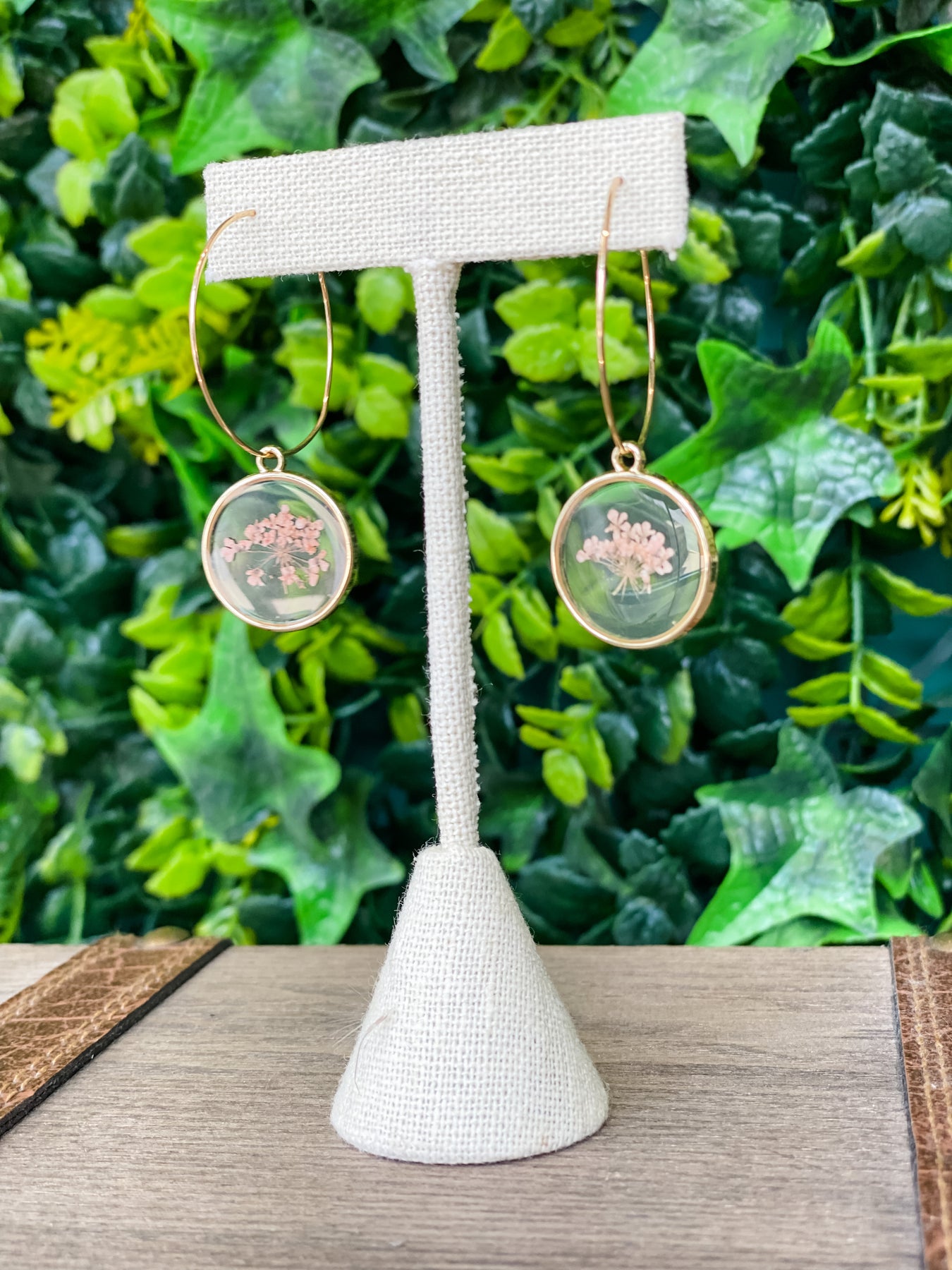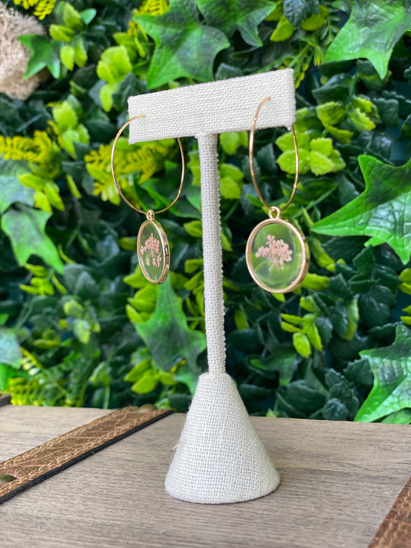 Complete your look with these beautiful, lightweight gold hoops. Featuring pressed flowers.