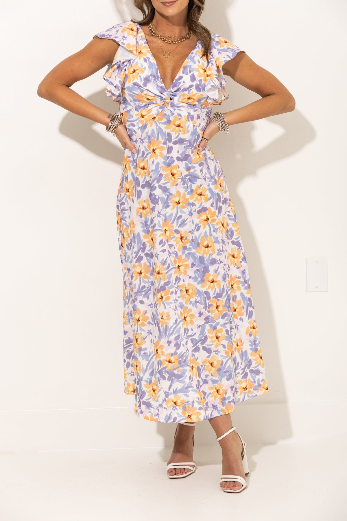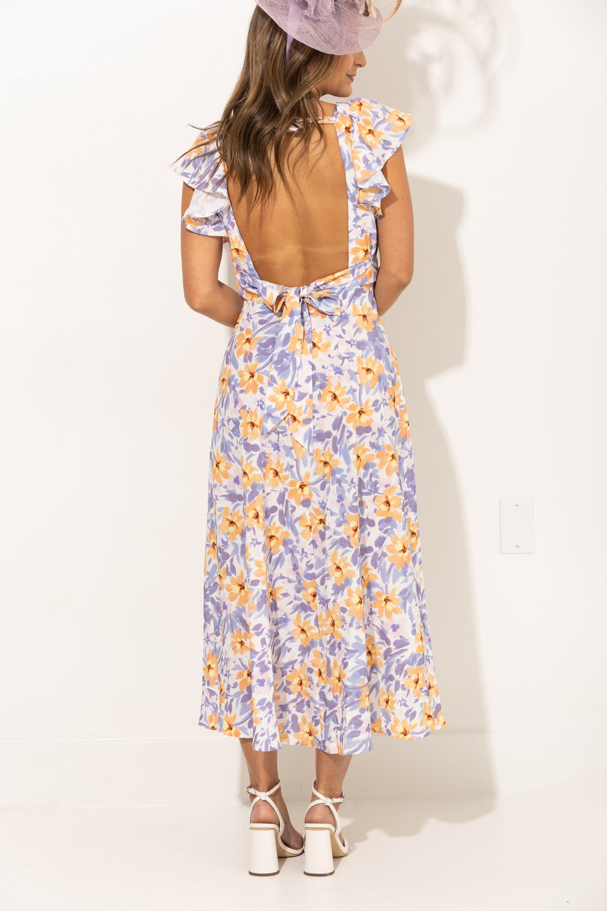 Make a lasting impression in this beautiful floral midi dress! Featuring plunging neckline with twisted detail, open back and ruffled flutter short sleeves. Runs small, size pictured, small. Model is 5'1, size 0/2.