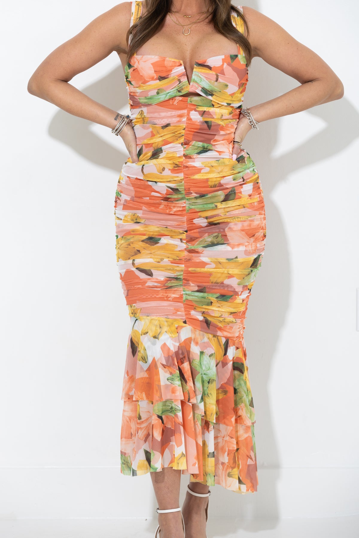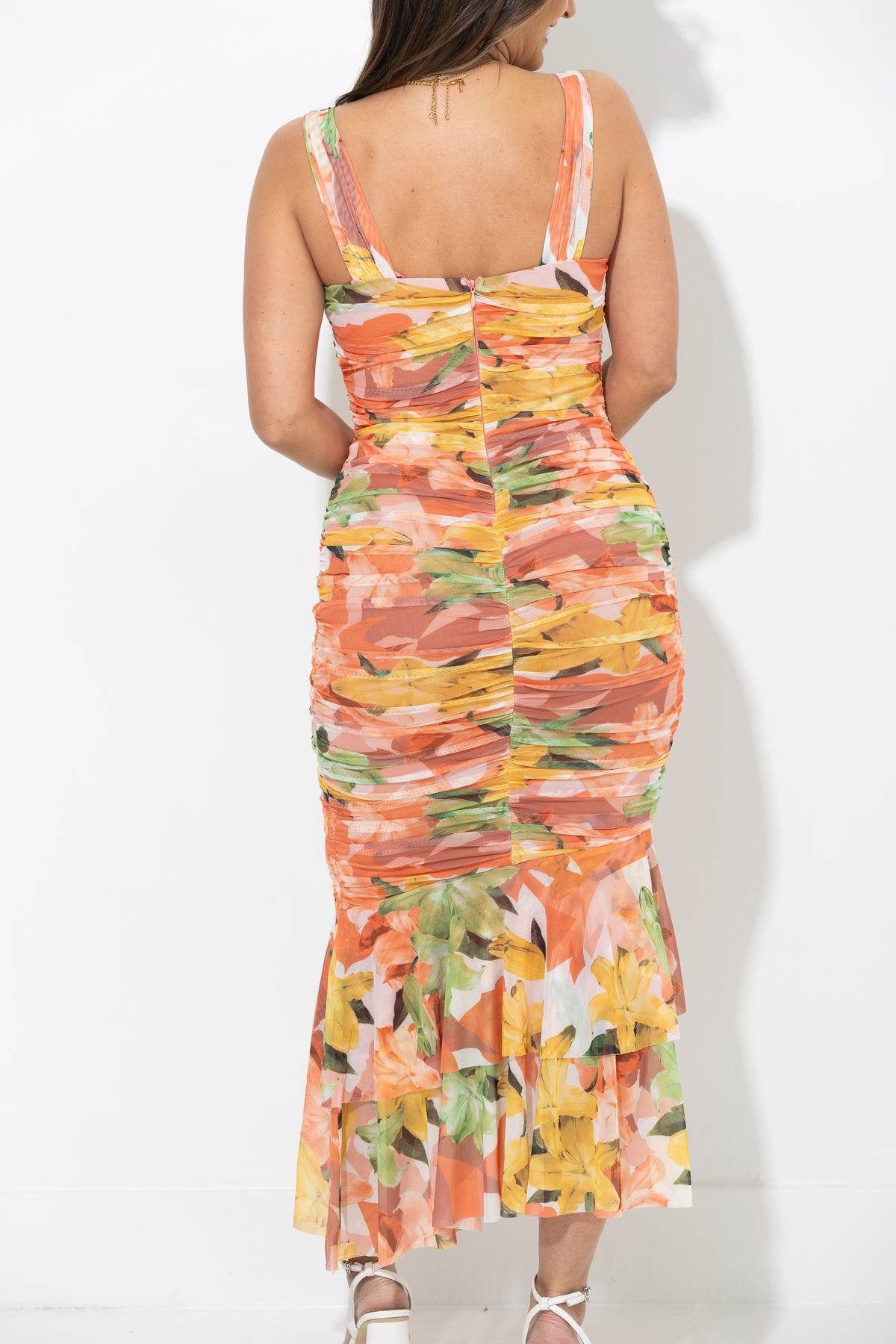 Heat things up this season in this sexy mesh bodycon dress! Ruched sides, front keyhole cutout detail and mermaid hem finish. Fully lined. Size pictured, small.  Model is 5'1, size 2/4.