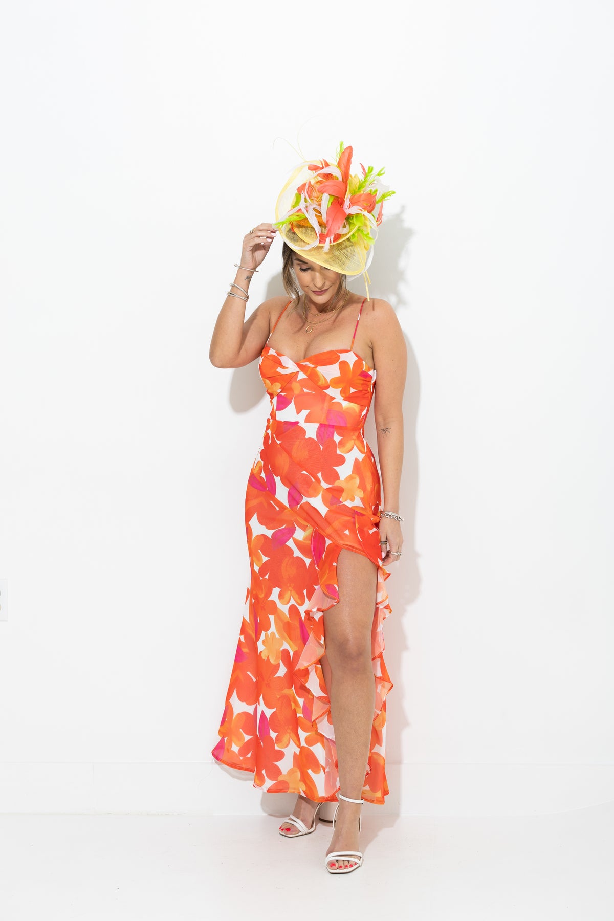 Simply stunning, we love this bright floral maxi! Adjustable straps, line with front slit. Product runs small. Size pictured, medium. Model is 5'1, size 2/4.