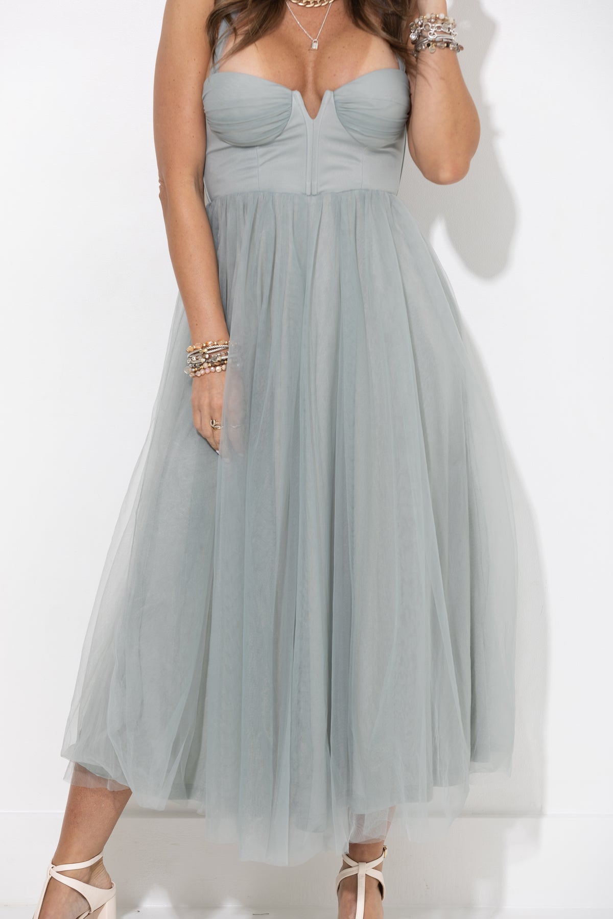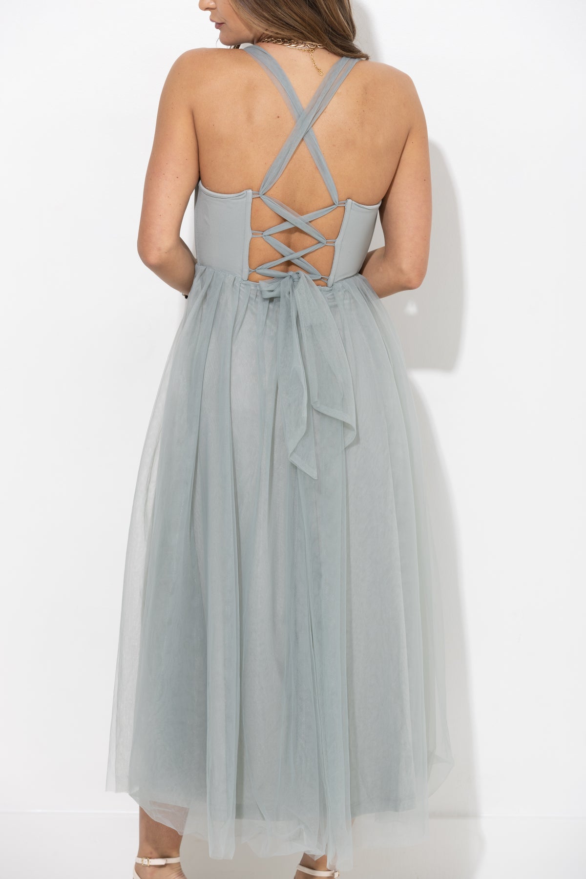 This dress is an absolute dream! Bustier style top with lace up back detail. Fully lined. Size pictured, small.