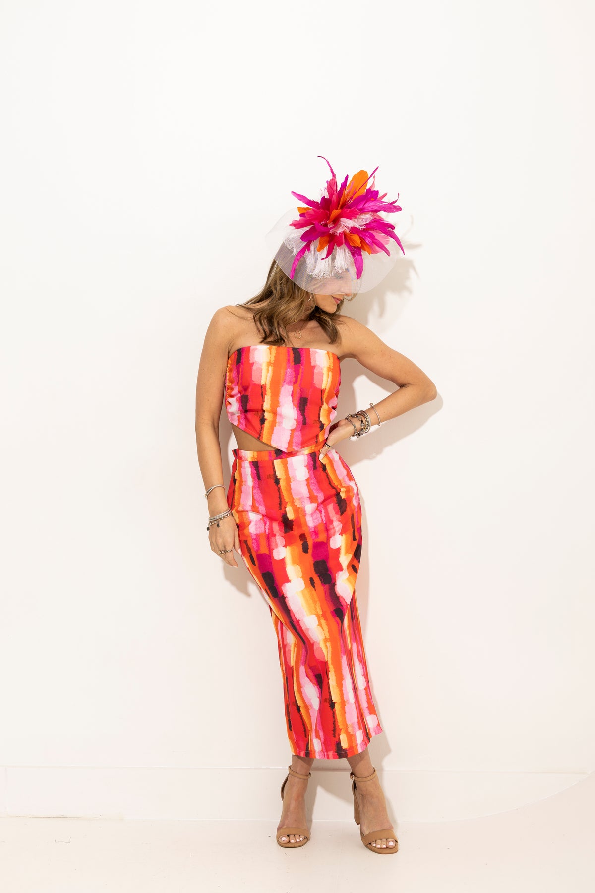 Let your flirty side shine in the Stun & Done Midi Set. This vibrant and eye-catching set features a strapless top with a smocked back for a flattering silhouette, and a mid-rise midi skirt with a discreet zipper. Get ready to make a bold statement and capture attention. Size pictured, small. Model is 5'1, size 0.