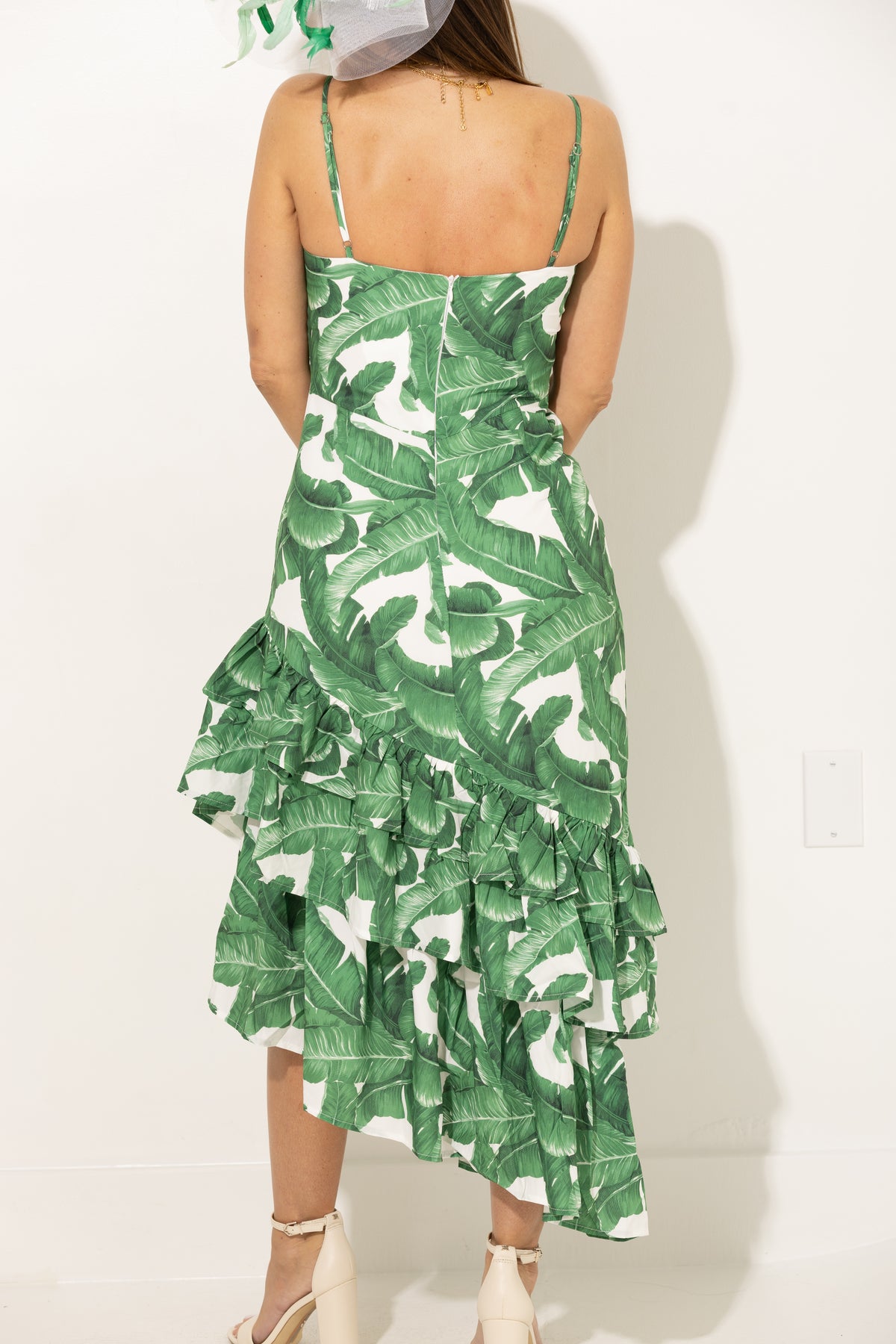 Steal the show in this stunning midi dress featuring bold leaf print, adjustable straps, and asymmetrical ruffle hem.