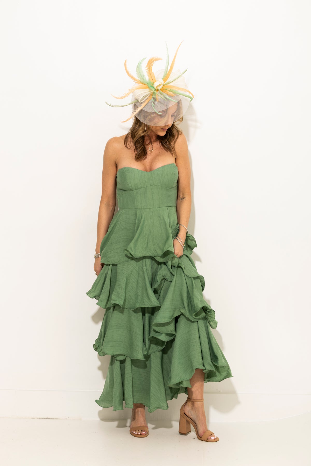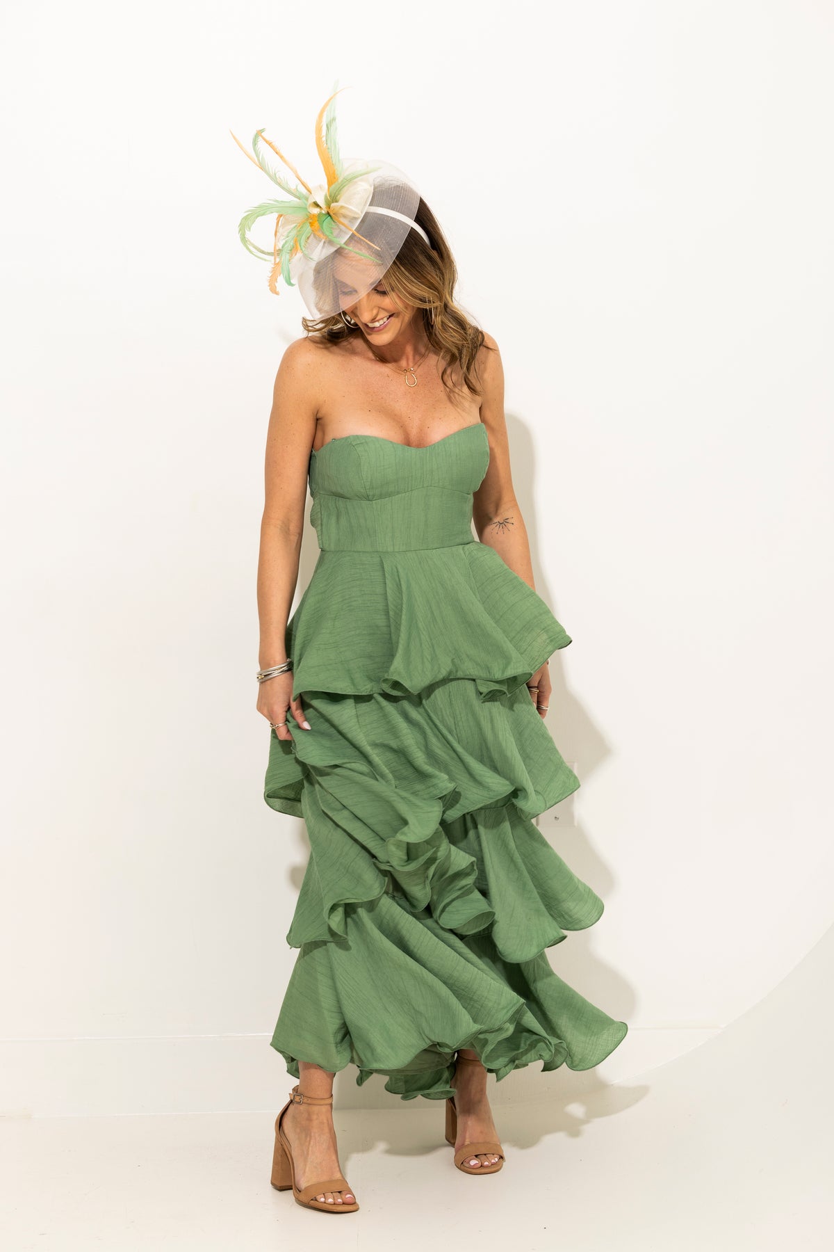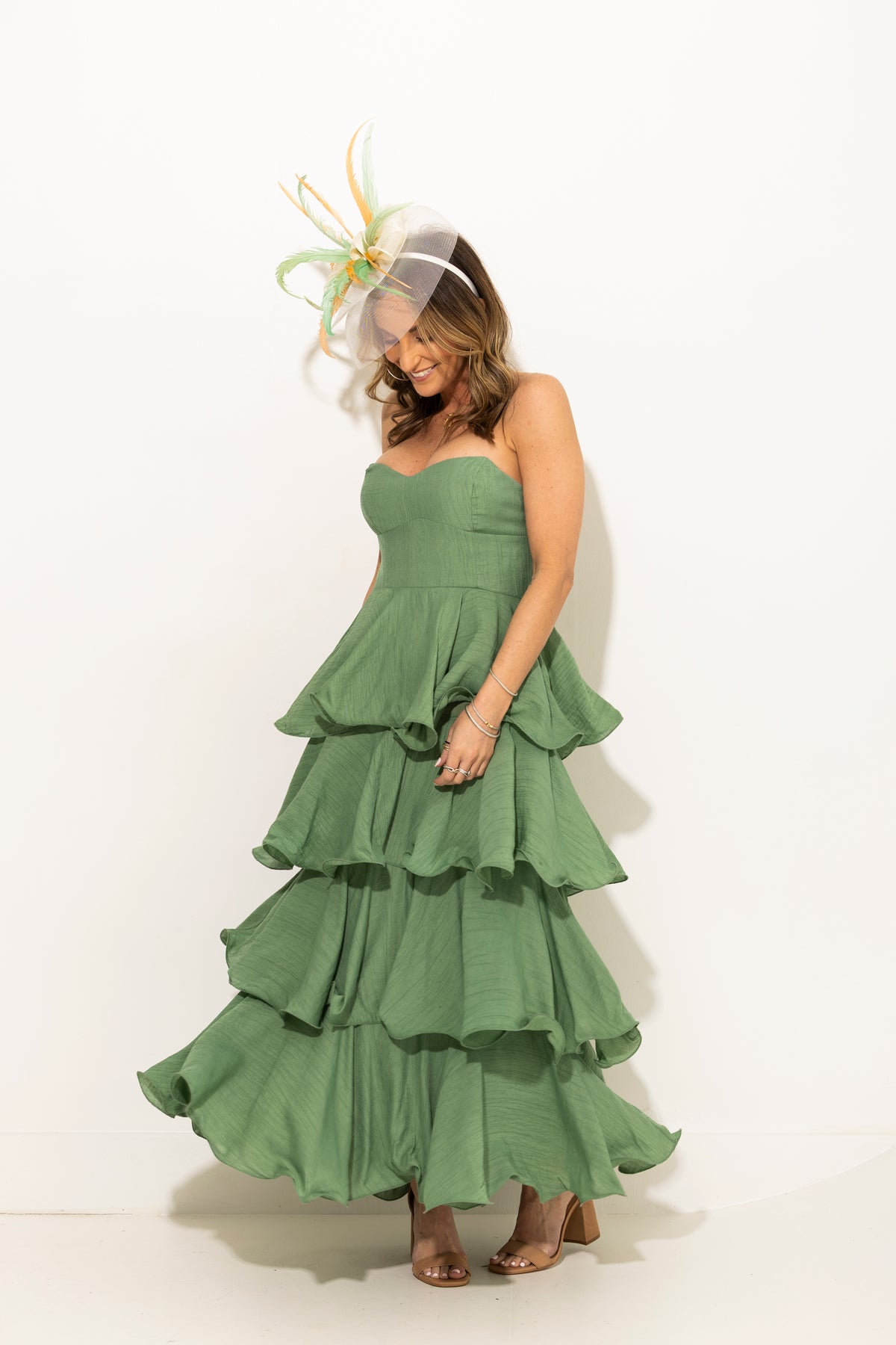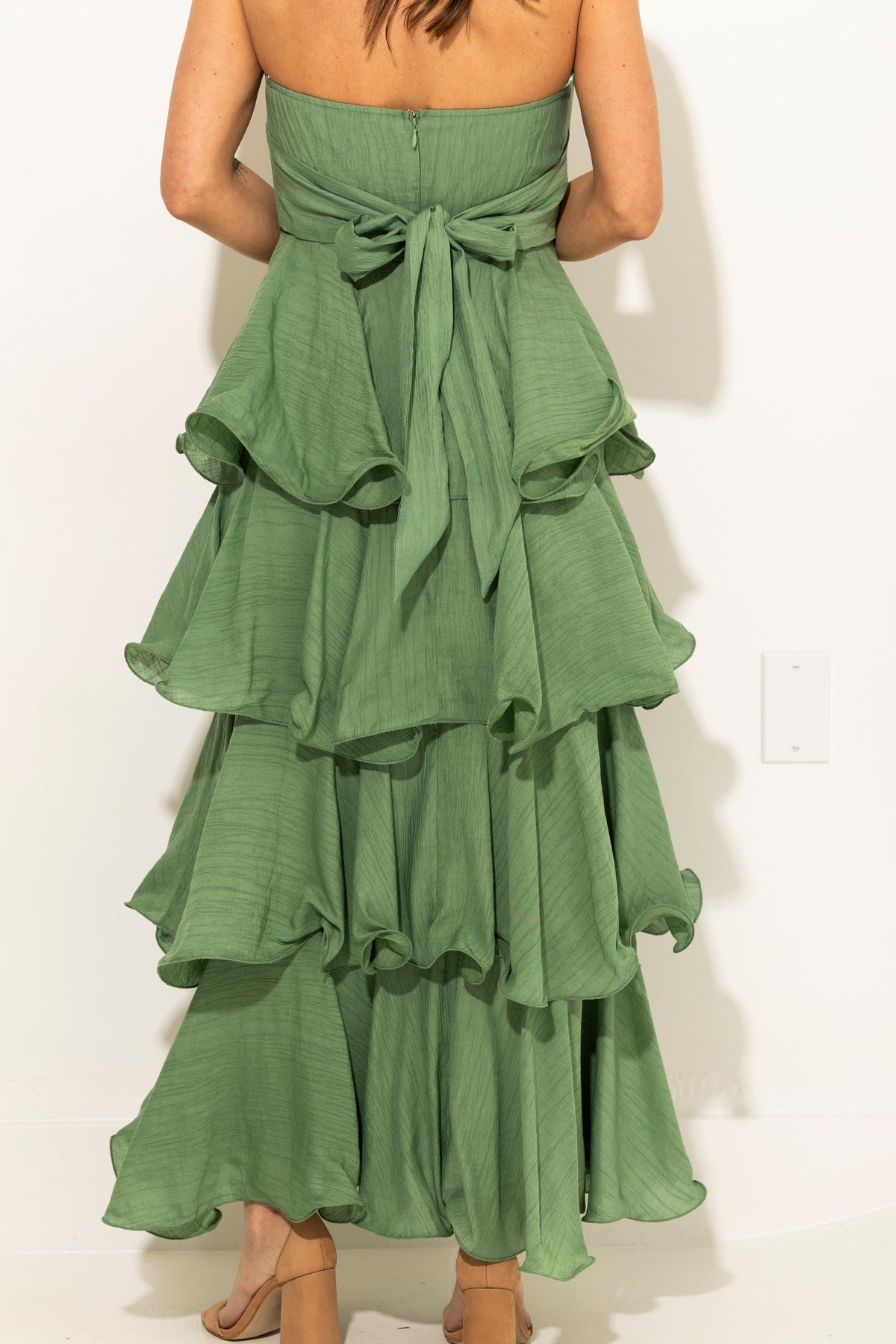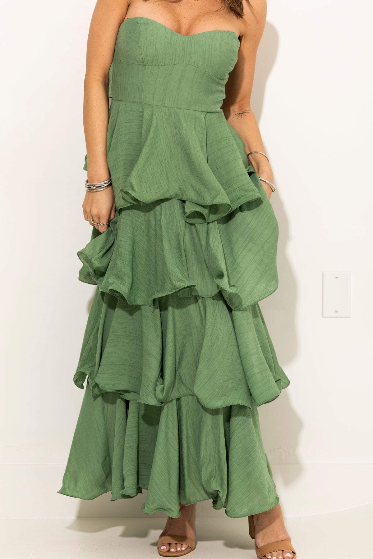 Dress to impress with our Love Poem Tiered Sage Maxi Dress. This stunning gown features a trendy sage color, cascading tiers, and a flattering strapless neckline. Complete with a self tie sash and hidden back zipper for a perfect fit. No-slip strips keep you comfortable while you dance the night away. Love has never looked so good! Size pictured, small. Model is 5'1, size 0.