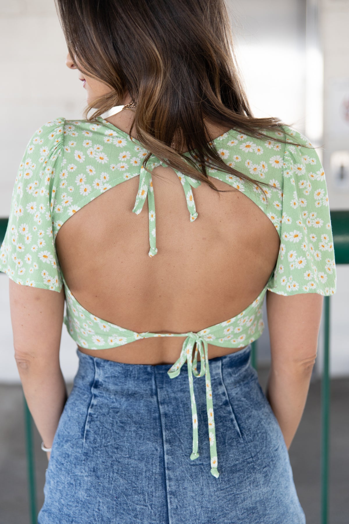 This floral has the cutest double tie back closure. A plunging V-neckline, cropped hem and short bell-sleeves. This top is perfect to pair with your favorite high rise shorts or a skirt.