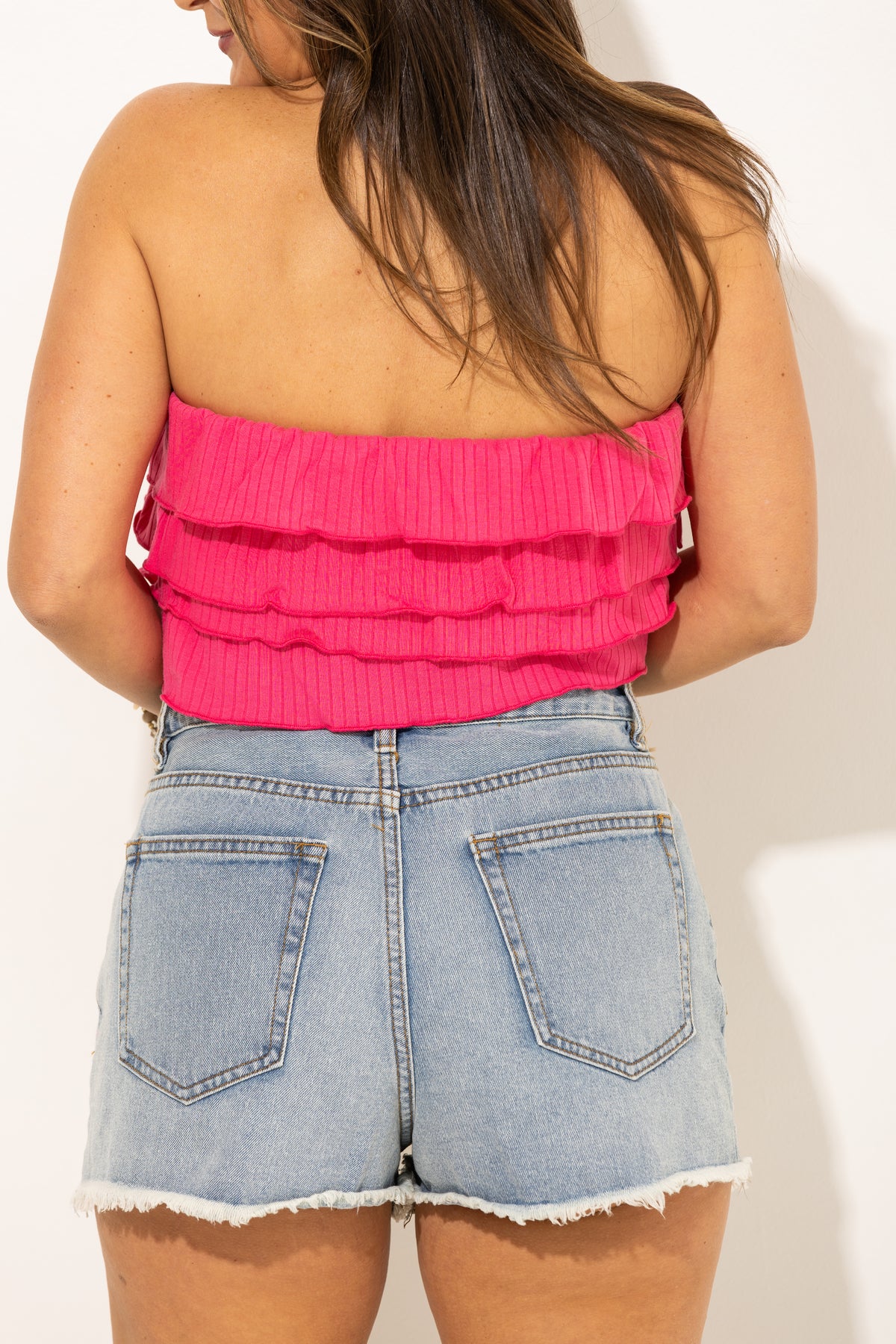 Have it your way in this cute, flirty ruffled strapless top! Style with your favorite denim or mini skirt for a fun brunch look or dress it up for date night! Size pictured, small.