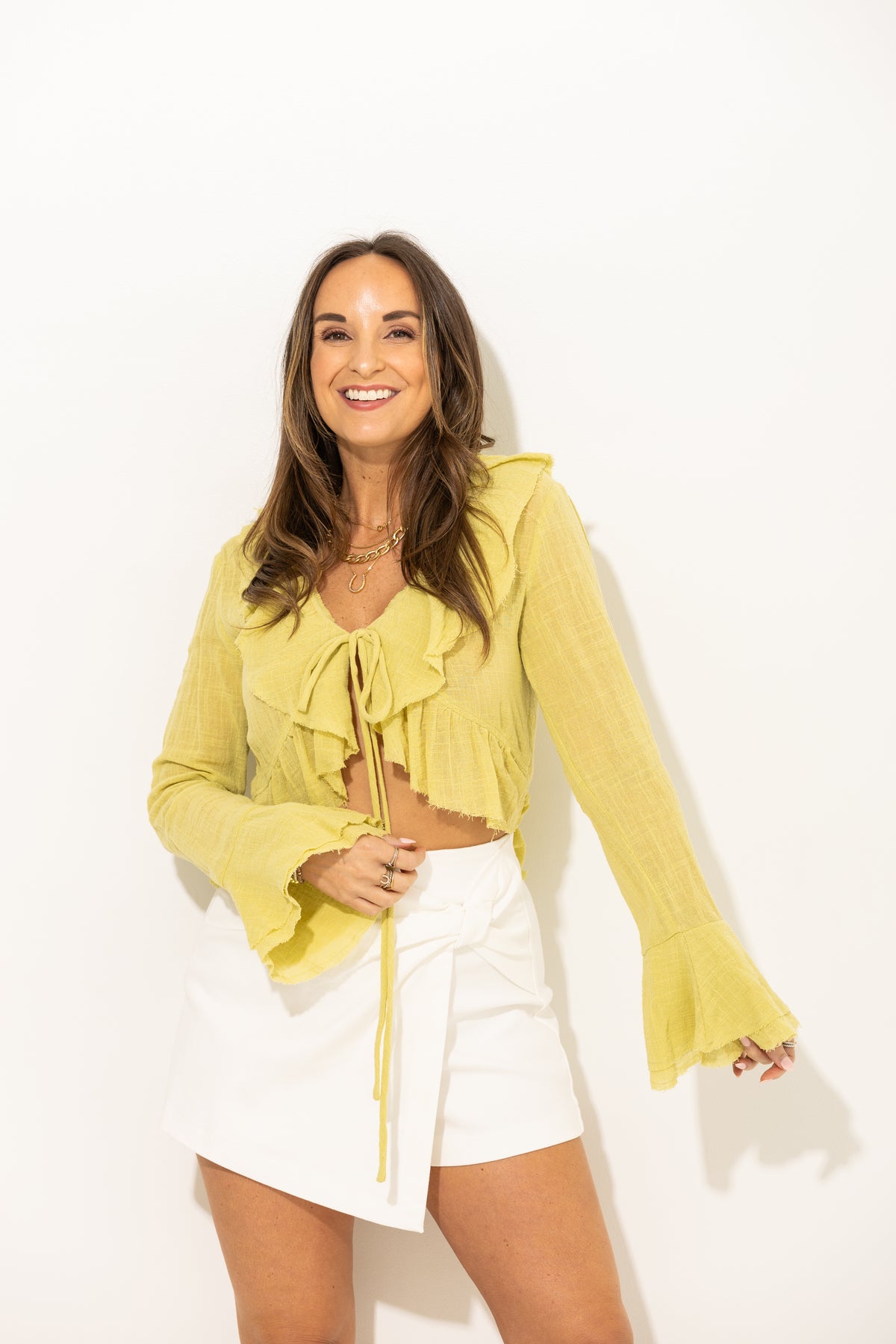 Zero second thoughts when it comes to this chic top, its a must! Light-weight, linen blend featuring ruffled detail with self-tie front closure. Product runs small. Size pictured, small.