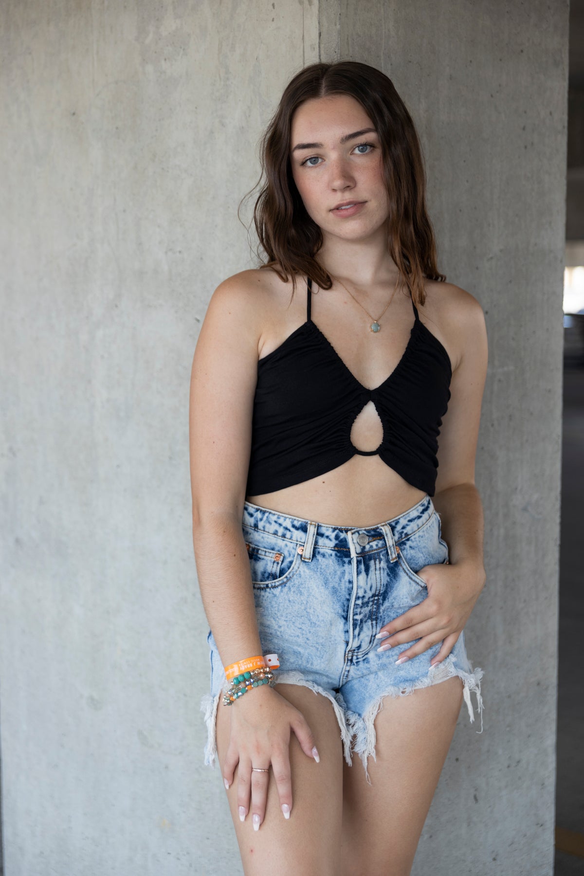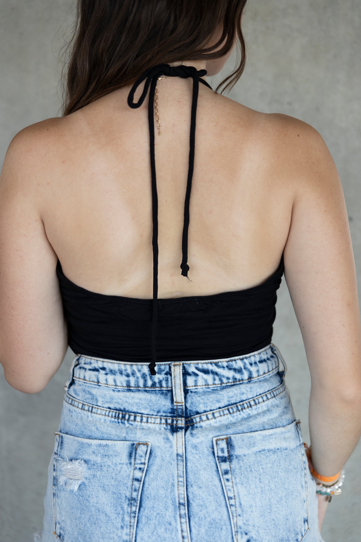 It's all in the details, and this top doesn't leave anything out. Cropped in length, front cutout detail with adjustable drawstring halter tie. Product runs small. Size pictured, small.