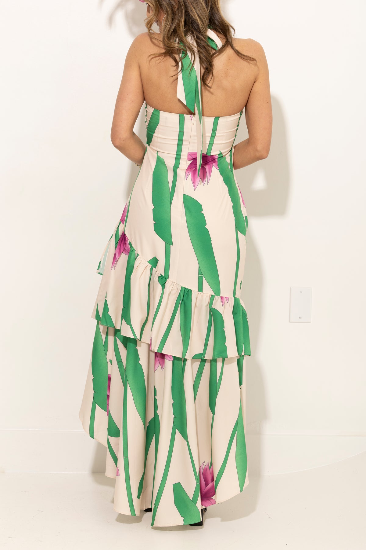 Feel like you're on a tropical getaway with our Sweet Escape Asymmetrical Dress! This bold and sexy dress features a ruffle asymmetrical hem, halter neckline, and a flirty front cutout detail. Fully lined and in a bold floral print, this dress is perfect for any occasion. Multiple styling options make it a must-have! Size pictured, small. Model is 5'1, size 0.