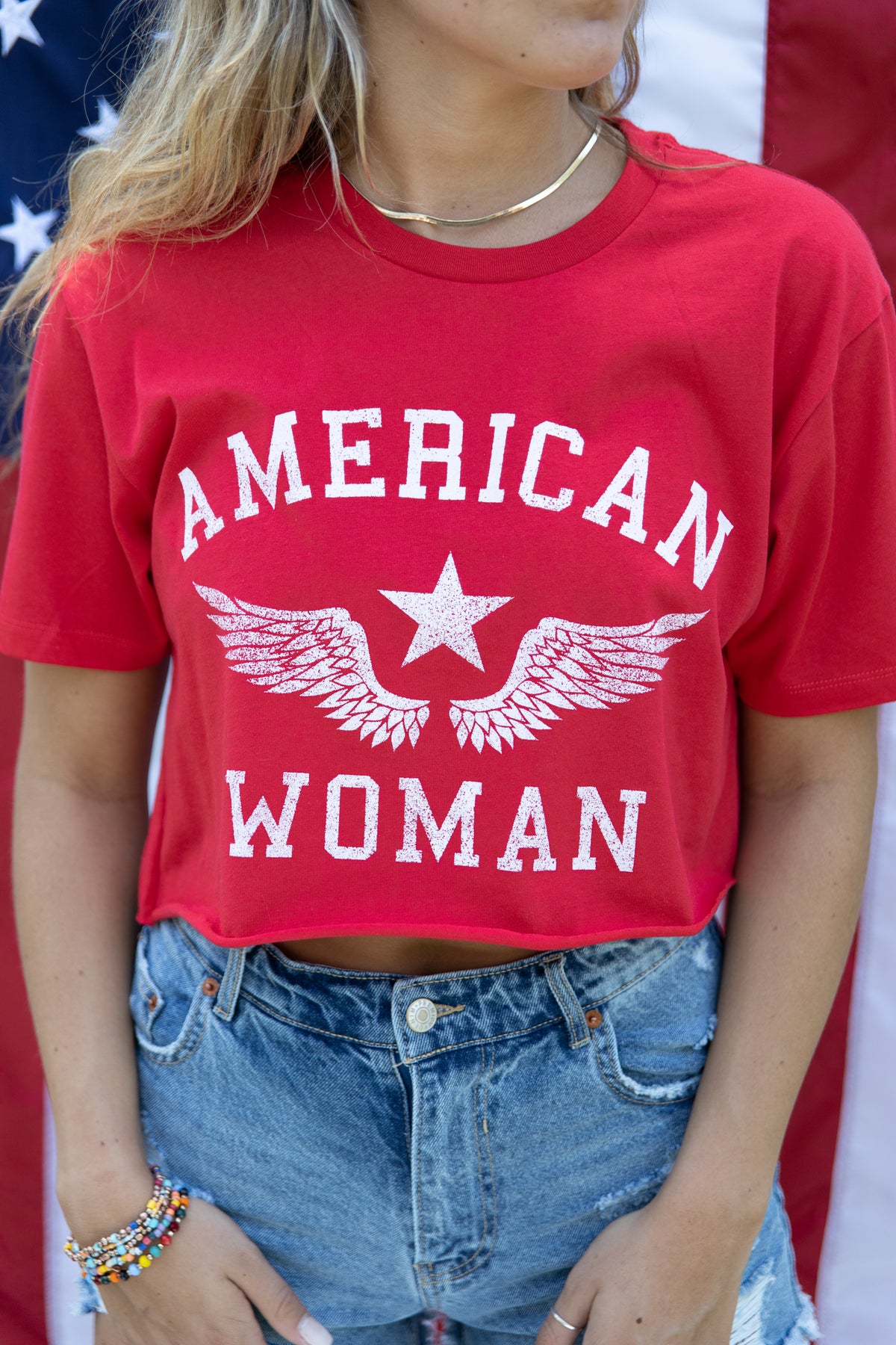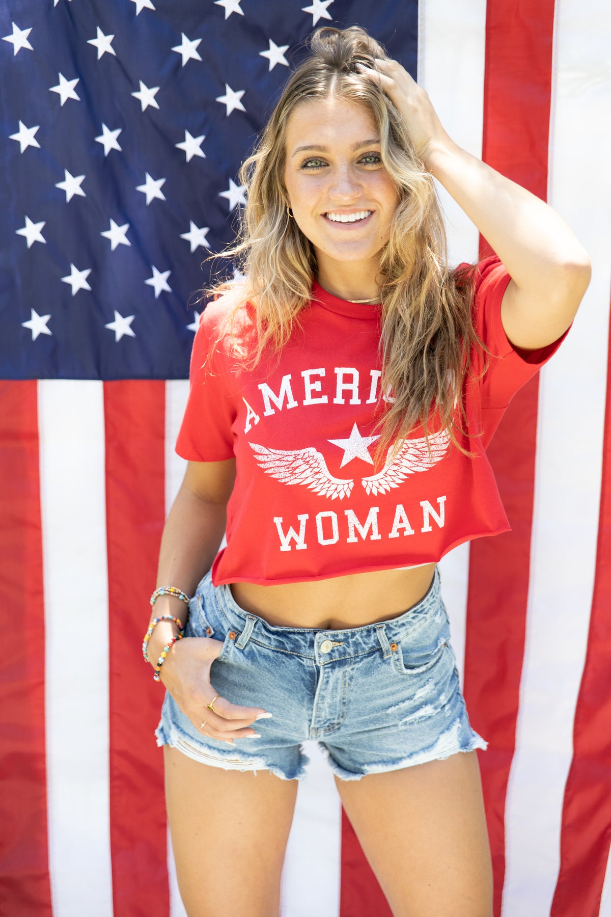 The American Woman Graphic Tee is the ultimate classic go-to! Vintage inspired, style with denim for a edgy look or throw on with lounge shorts for the pool or boat! Available in cropped length and full length. Size pictured, small.