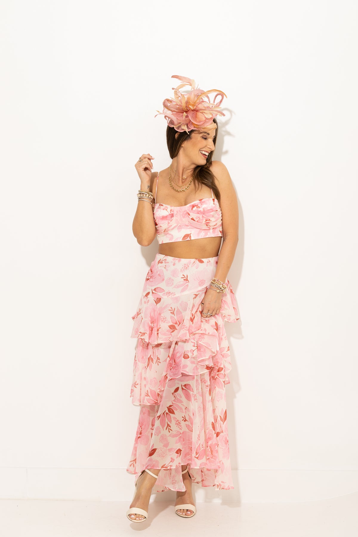 Make the most of your summer outings in this stunning two piece floral maxi set! Cropped top with adjustable straps, smocked backing and back zipper. Ruffled maxi skirt with hidden back zipper. Size pictured, medium.