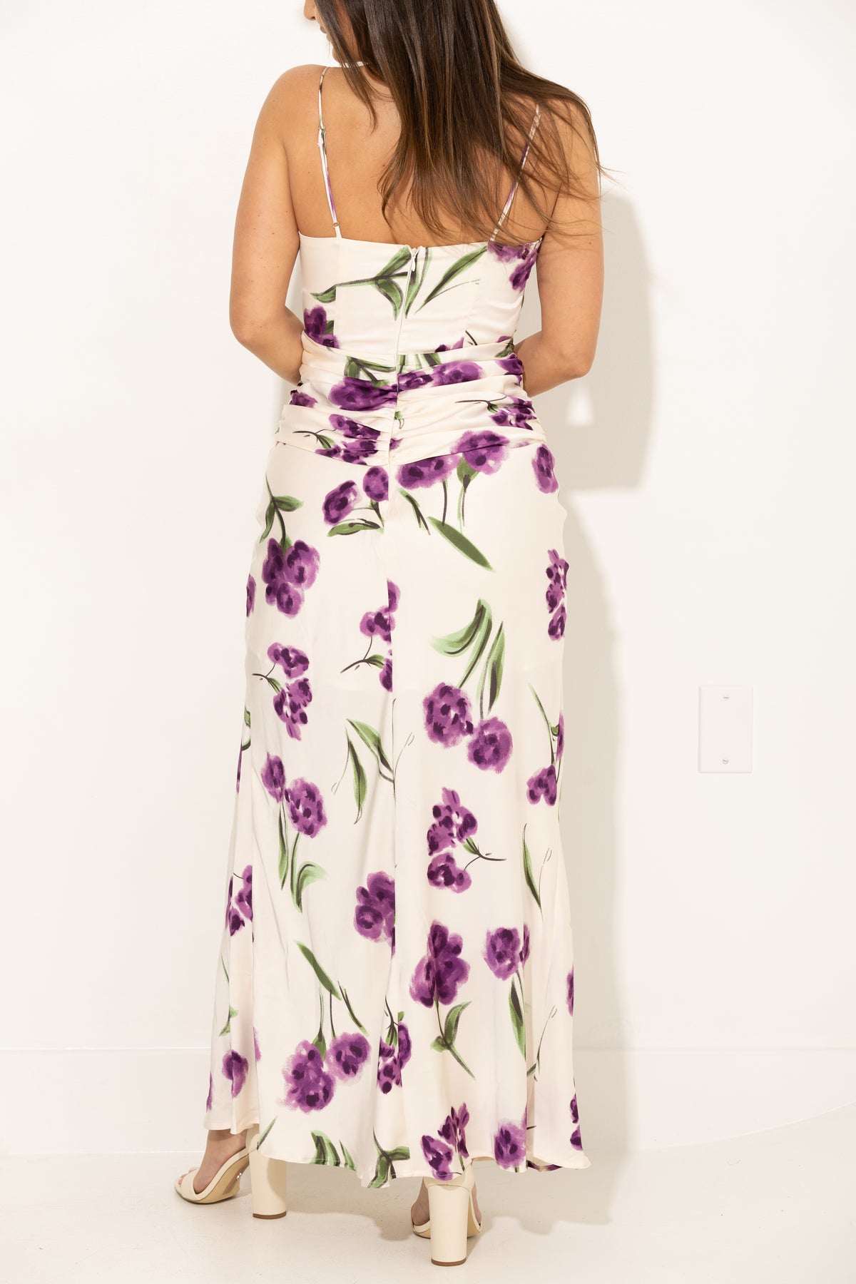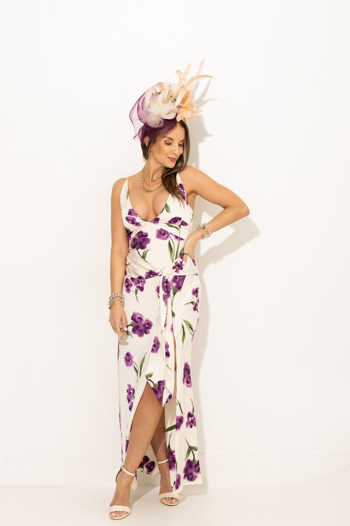 Absolutely stunning! This silky satin maxi dress features a bold purple floral print with adjustable front tie, front slit and ruched back detail. Size pictured, small. Model is 5'1, size 2.